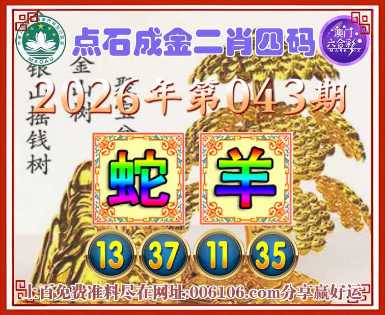 043期:《点石成金》  ♣️二肖四码 ♣️【羊】【13.37.11.35】开:蛇13准公开见证
