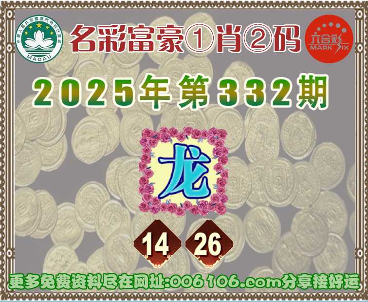 332期:〖名彩富豪〗 ♣️①肖②码♣️【】【14.26】开:龙26
