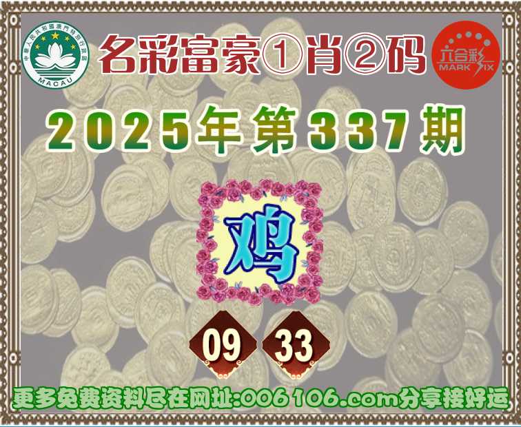 337期:〖名彩富豪〗 ♣️①肖②码♣️【】【09.33】开:鸡09准公开见证